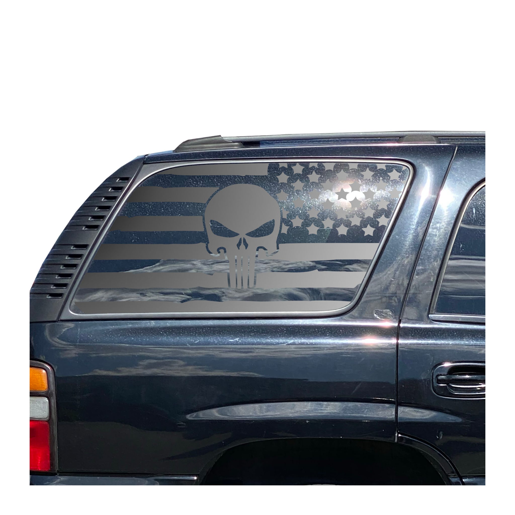 This is a custom designed USA Flag Decal with Skull for 2000-2006 Chevy Tahoe Rear Third Window