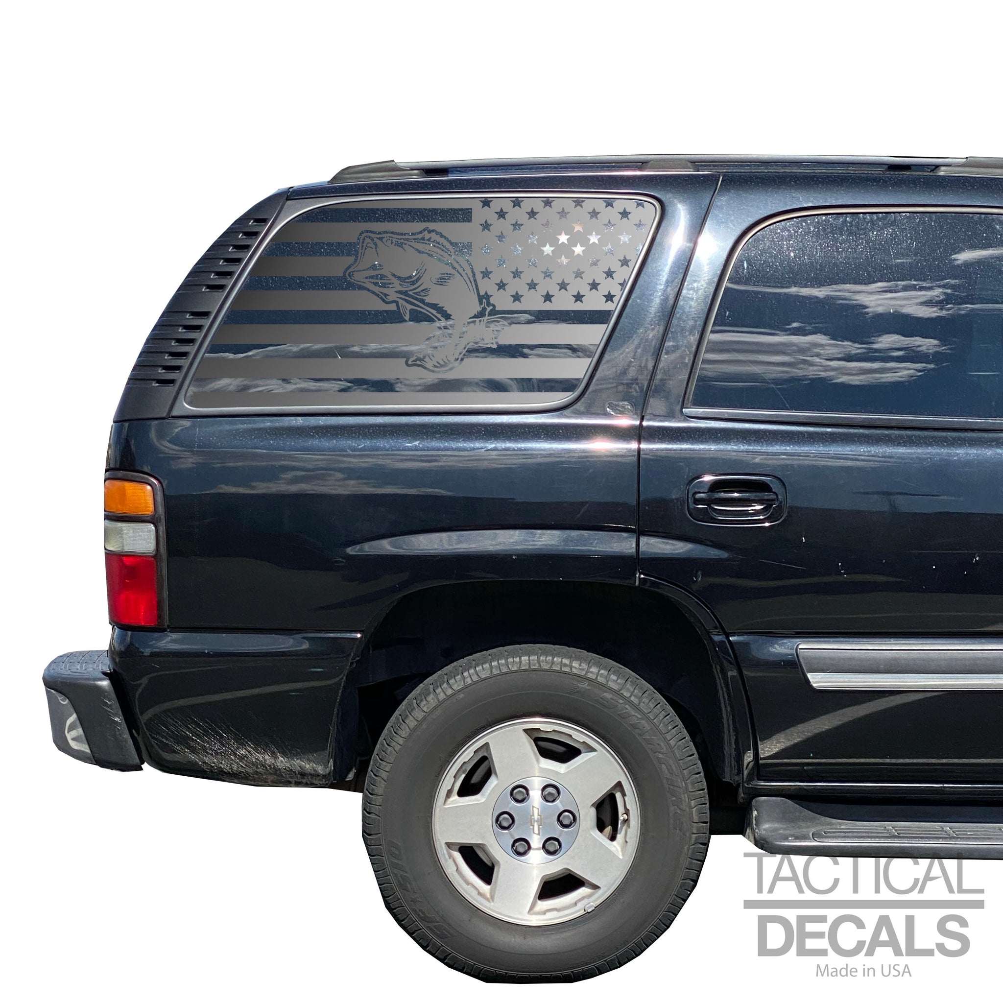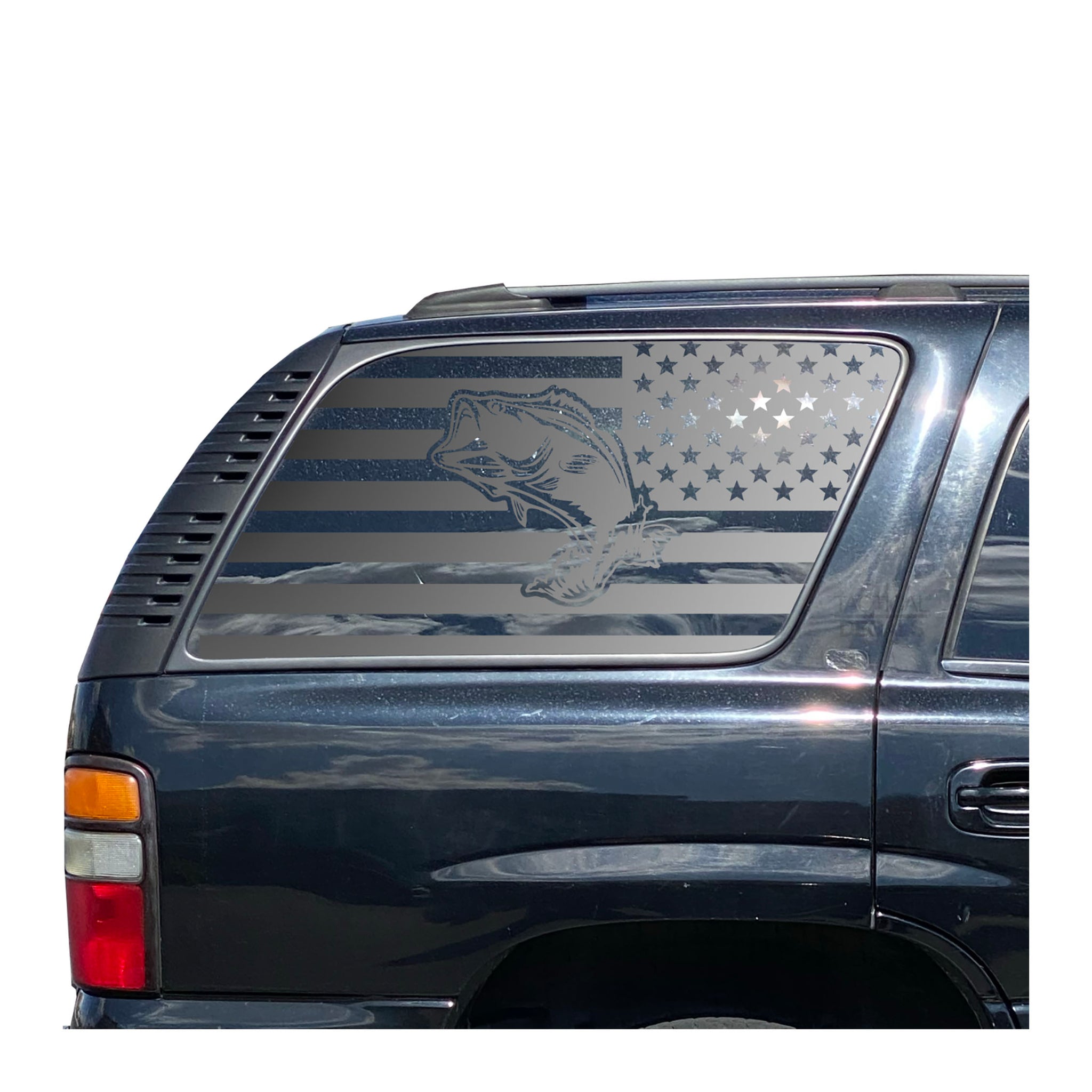 This is a custom designed USA Flag Decal with Bass Fishing for 2000-2006 Chevy Tahoe Rear Third Window