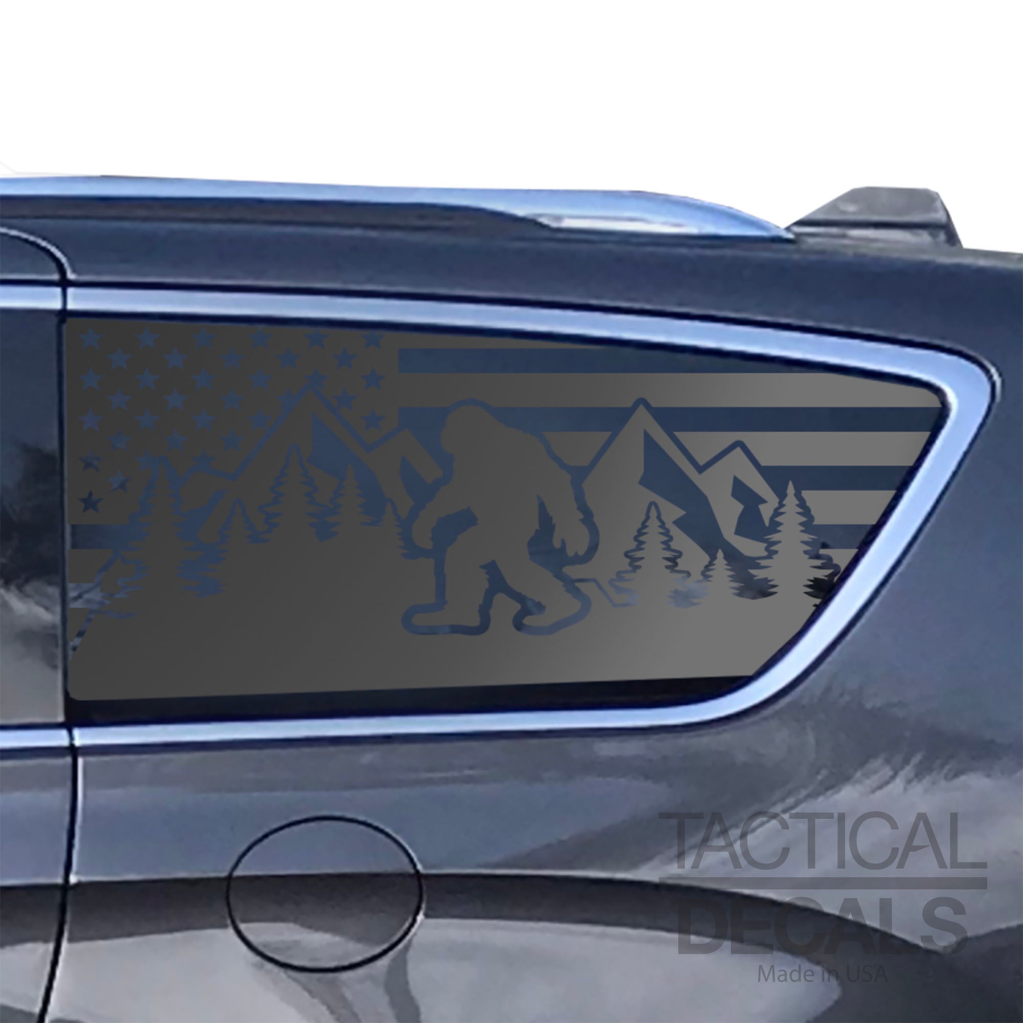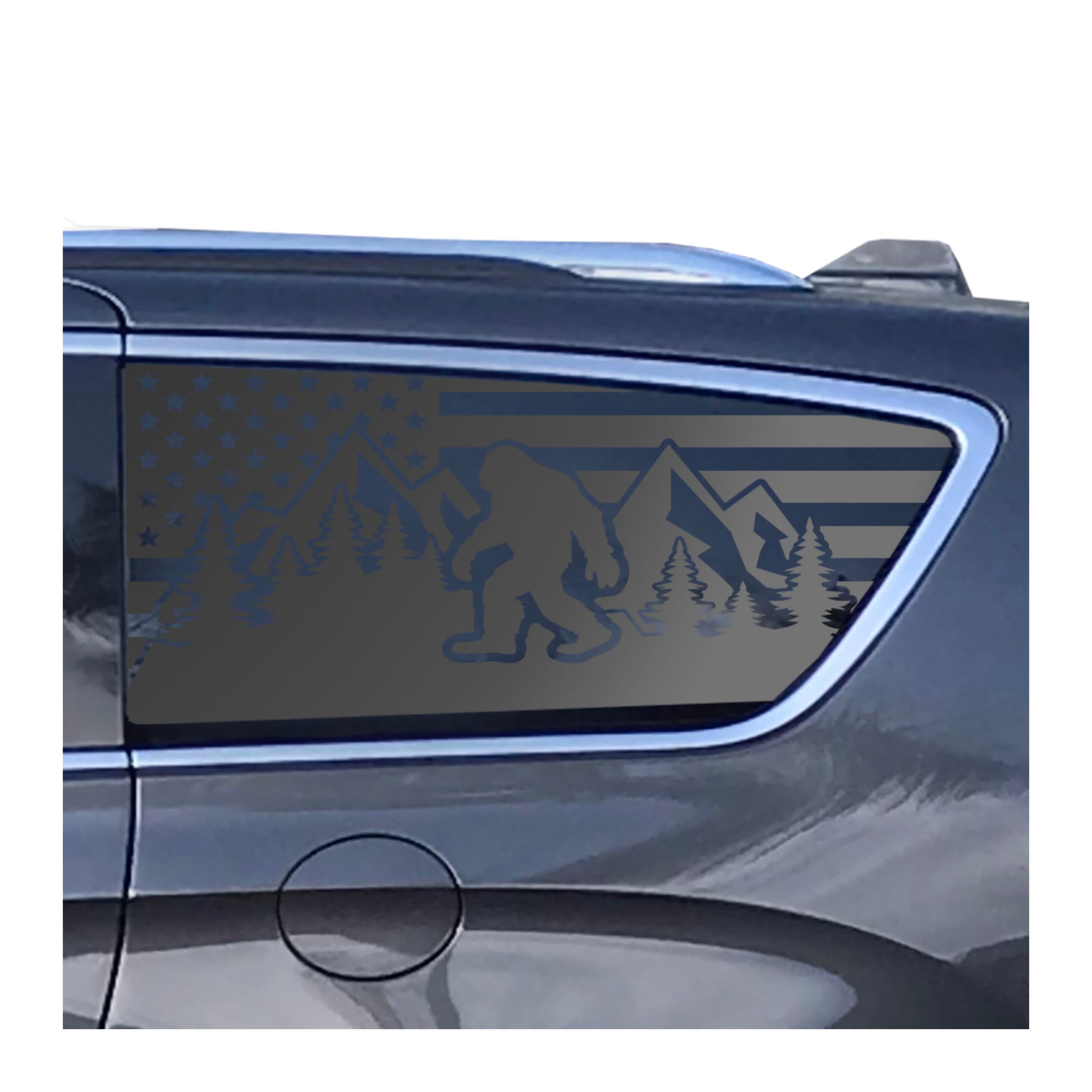 This is a custom designed USA Flag Decal with Sasquatch for 2017-2025 Chrysler  Pacifica Rear Third Window