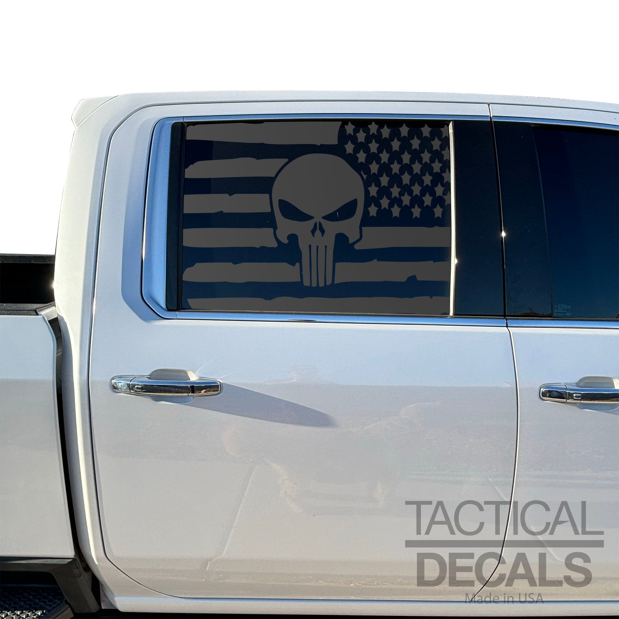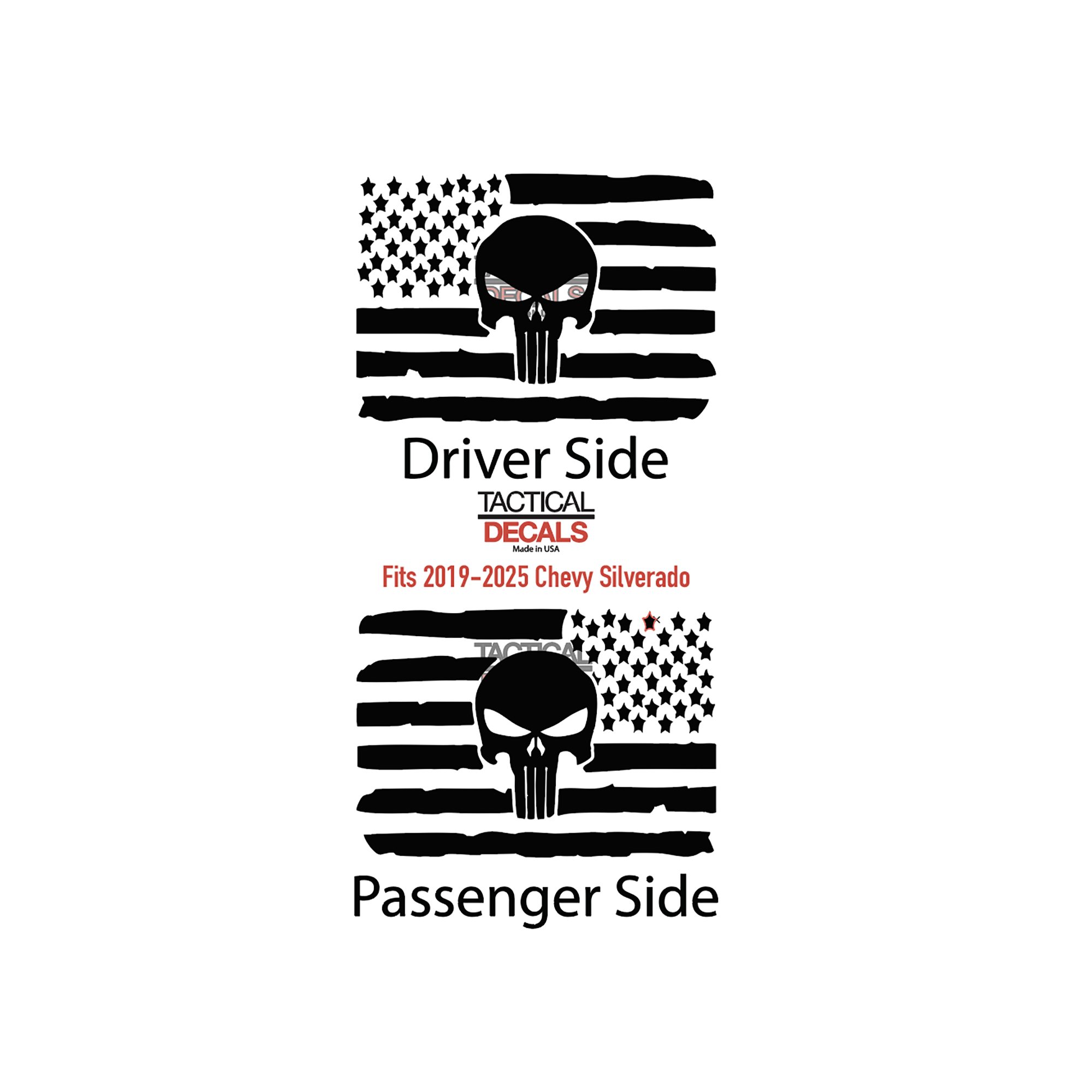 This is a custom designed USA Flag Decal with Skull for 2019-2025 Chevy Silverado Rear Window