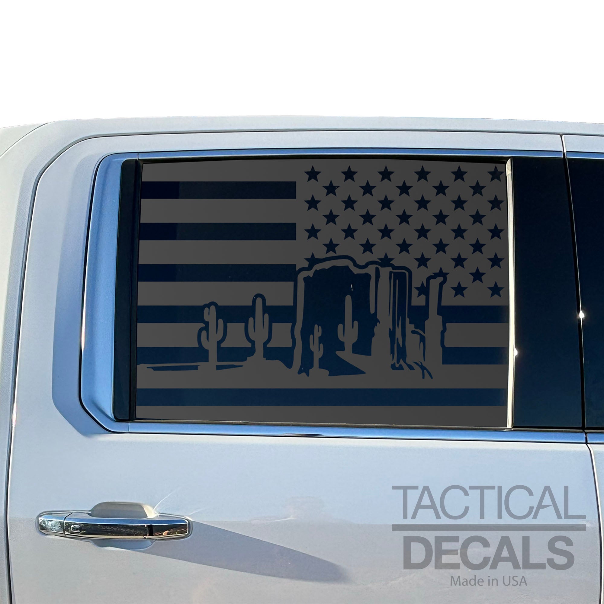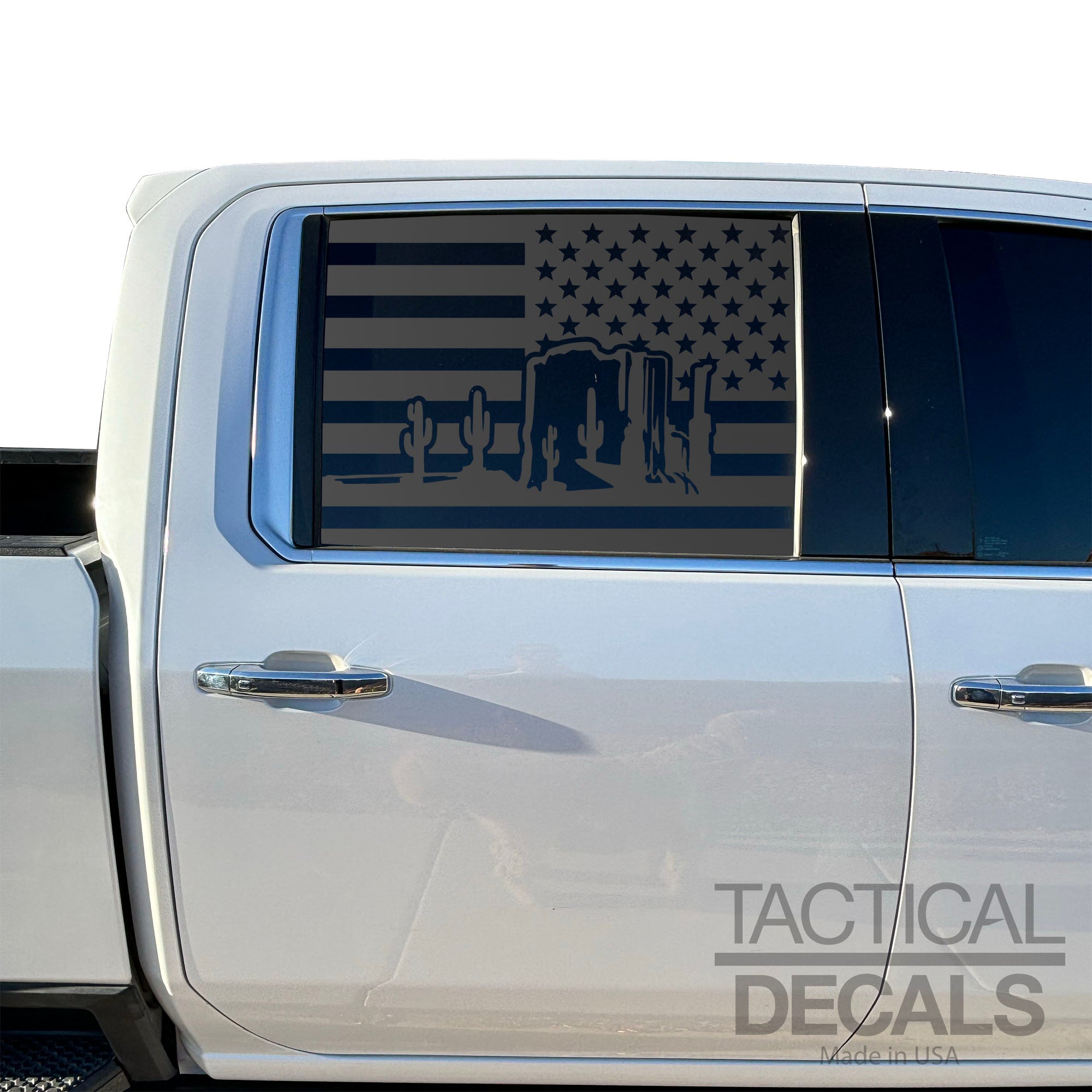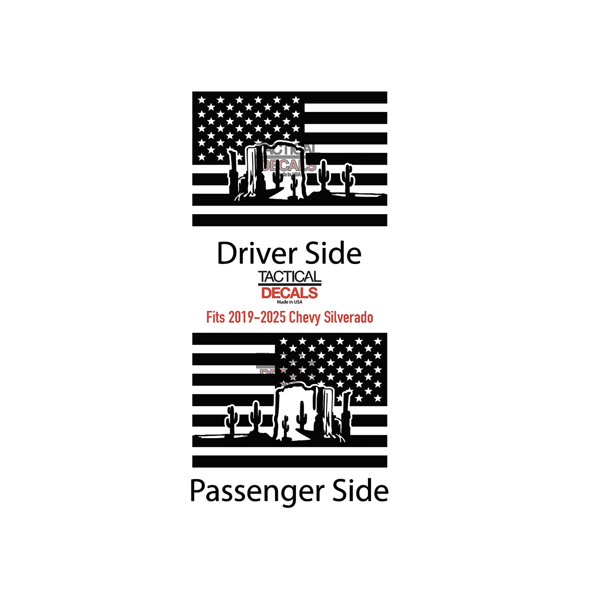 USA Flag Decal with Arizona Desert Scene for 2019-2025 Chevy Silverado Rear Window - Matte Black
