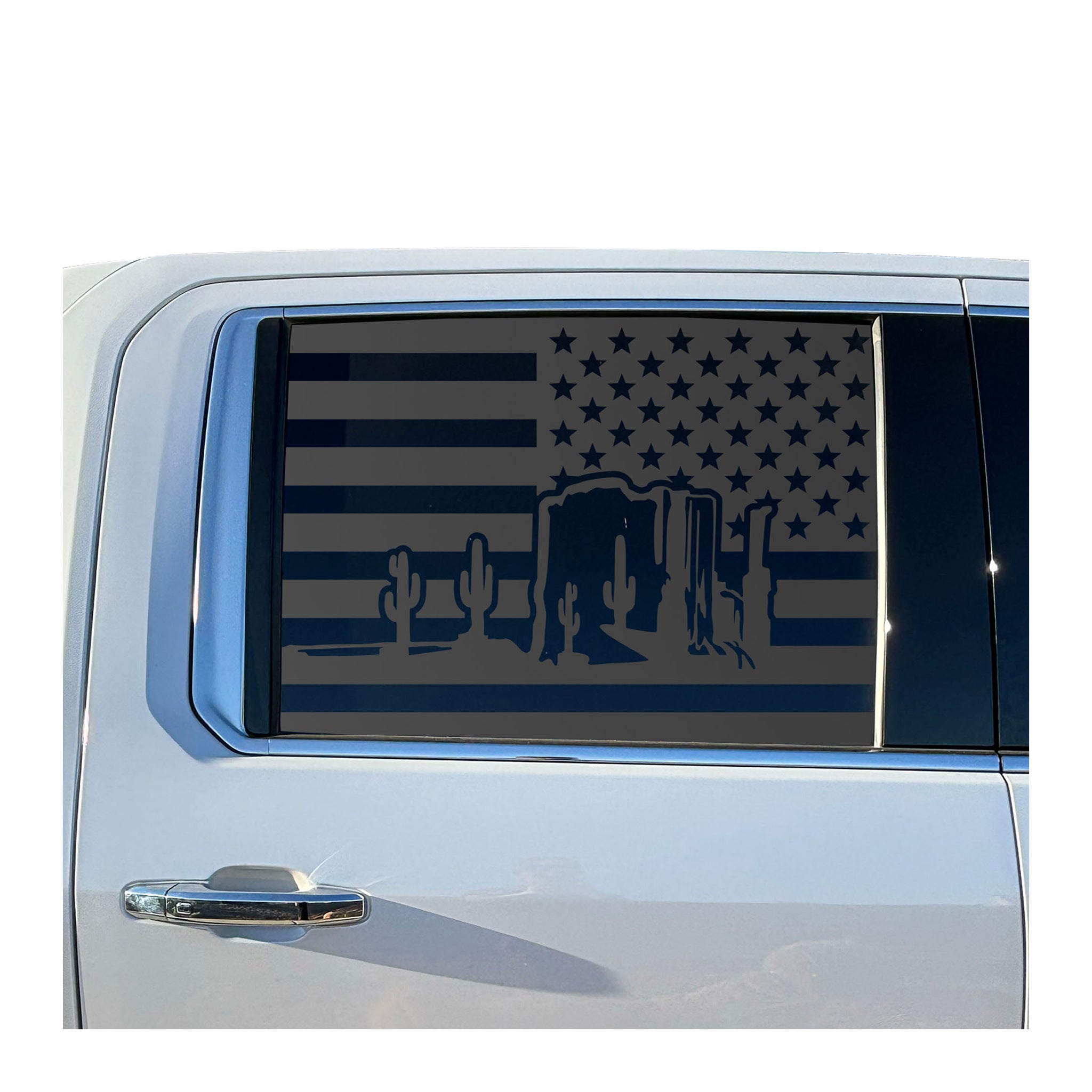 This is a custom designed USA Flag Decal with Arizona Desert Scene for 2019-2025 Chevy Silverado Rear Window