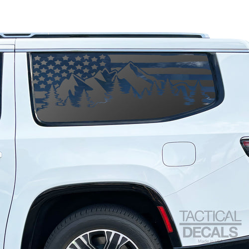 Distressed USA Flag with Mountains Decals for 2022-2024 Jeep Grand Wagoneer L 3rd Windows - Matte Black