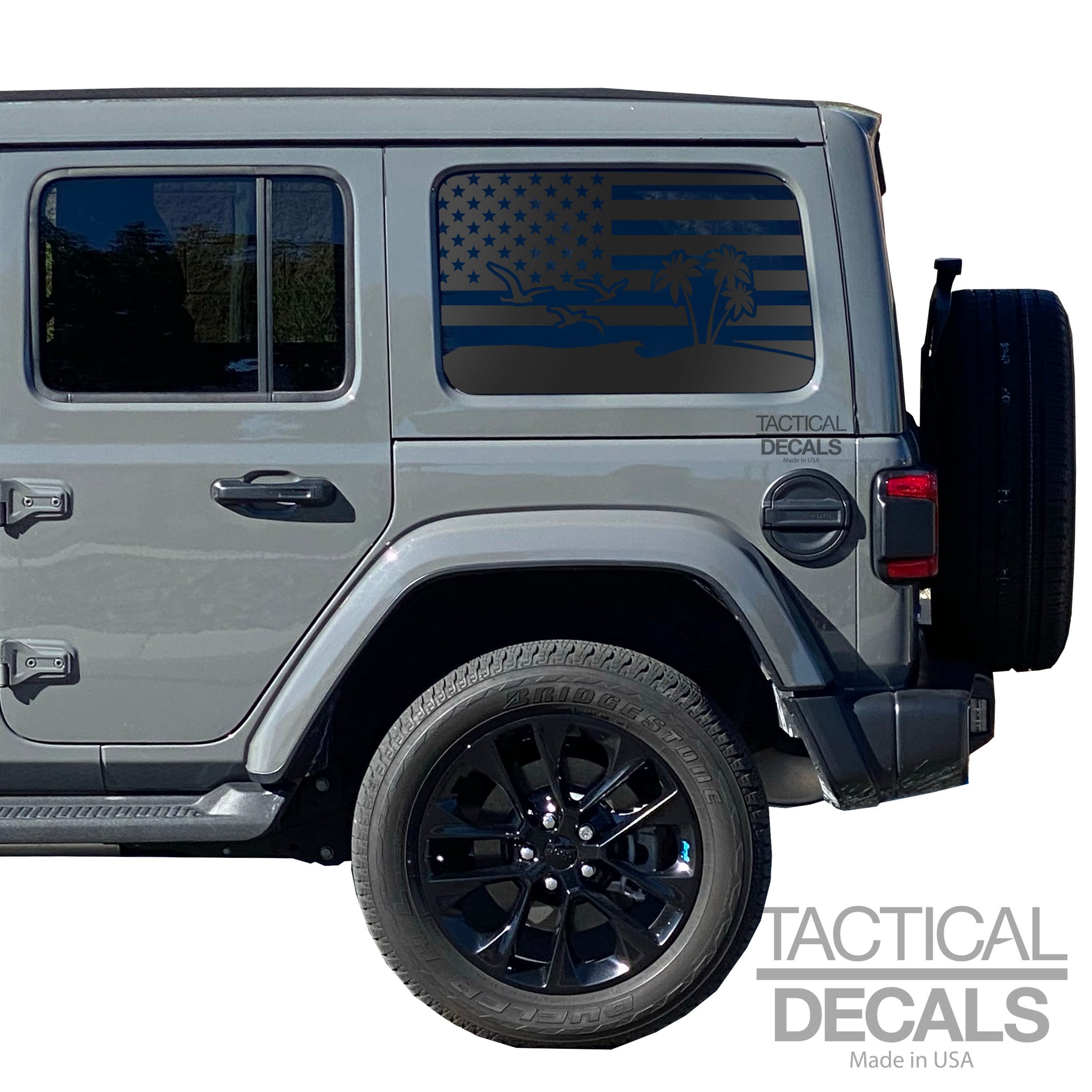 USA Flag w/ Beach Palm Tree scene Decal for 2007 - 2023 Jeep Wrangler 4 Door only - Hardtop Windows - Matte Black