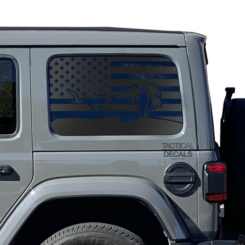 USA Flag w/ Beach Palm Tree scene Decal for 2007 - 2023 Jeep Wrangler 4 Door only - Hardtop Windows - Matte Black