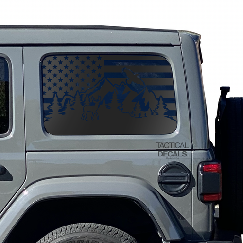 USA Flag w/Wildlife Mountain scene Decal for 2007 - 2023 Jeep Wrangler 4 Door only - Hardtop Windows - Matte Black