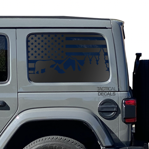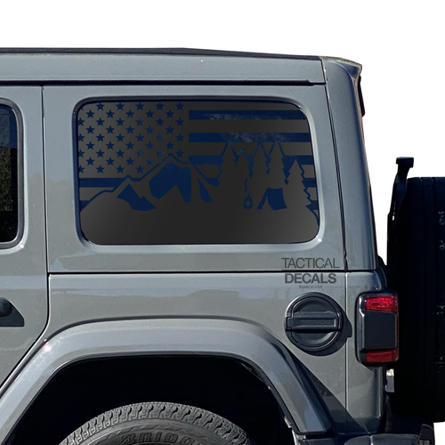 USA Flag w/Camping Mountain scene Decal for 2007 - 2023 Jeep Wrangler 4 Door only - Hardtop Windows - Matte Black