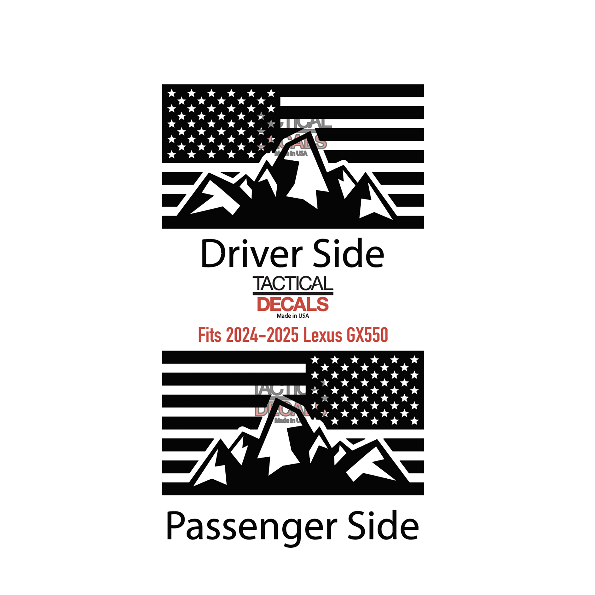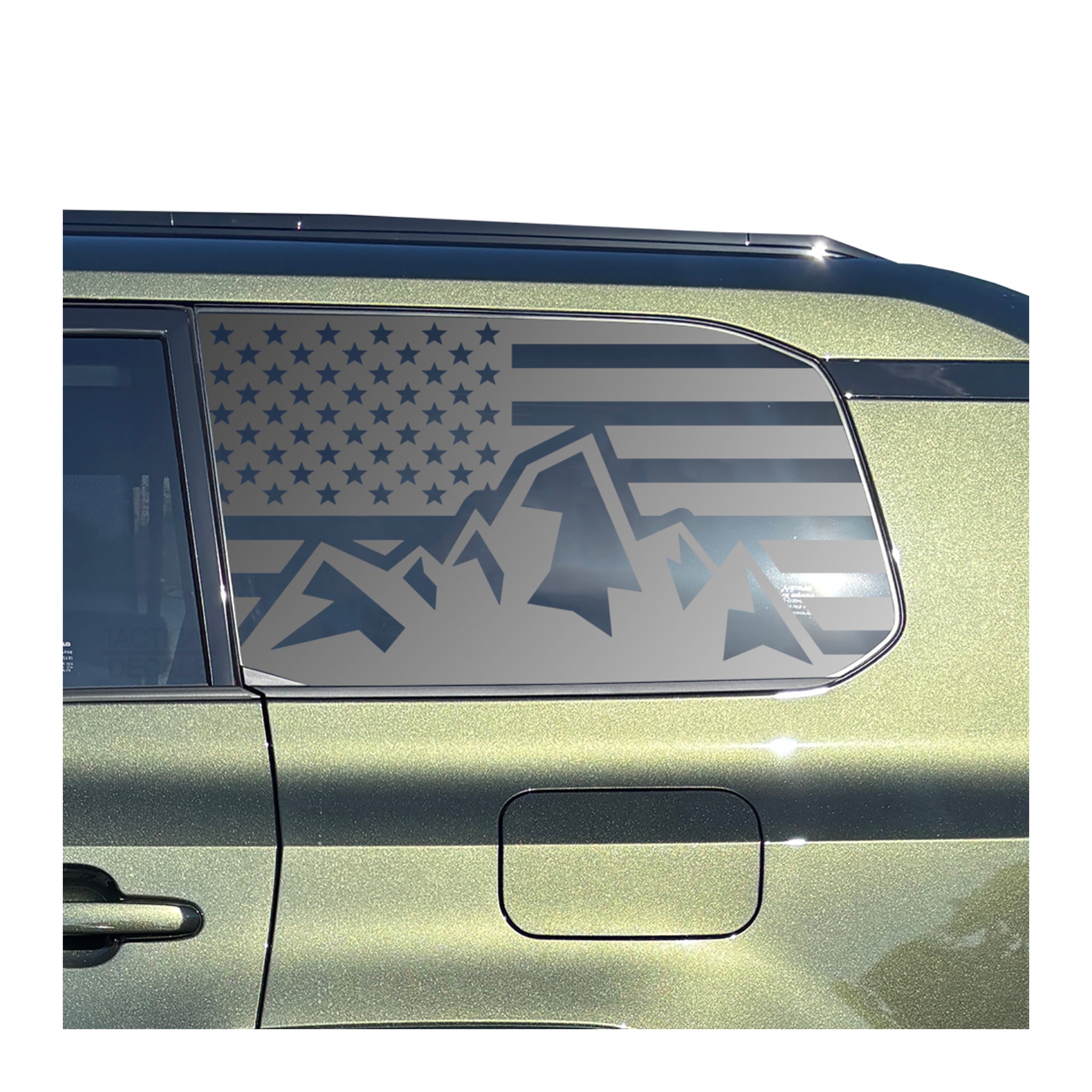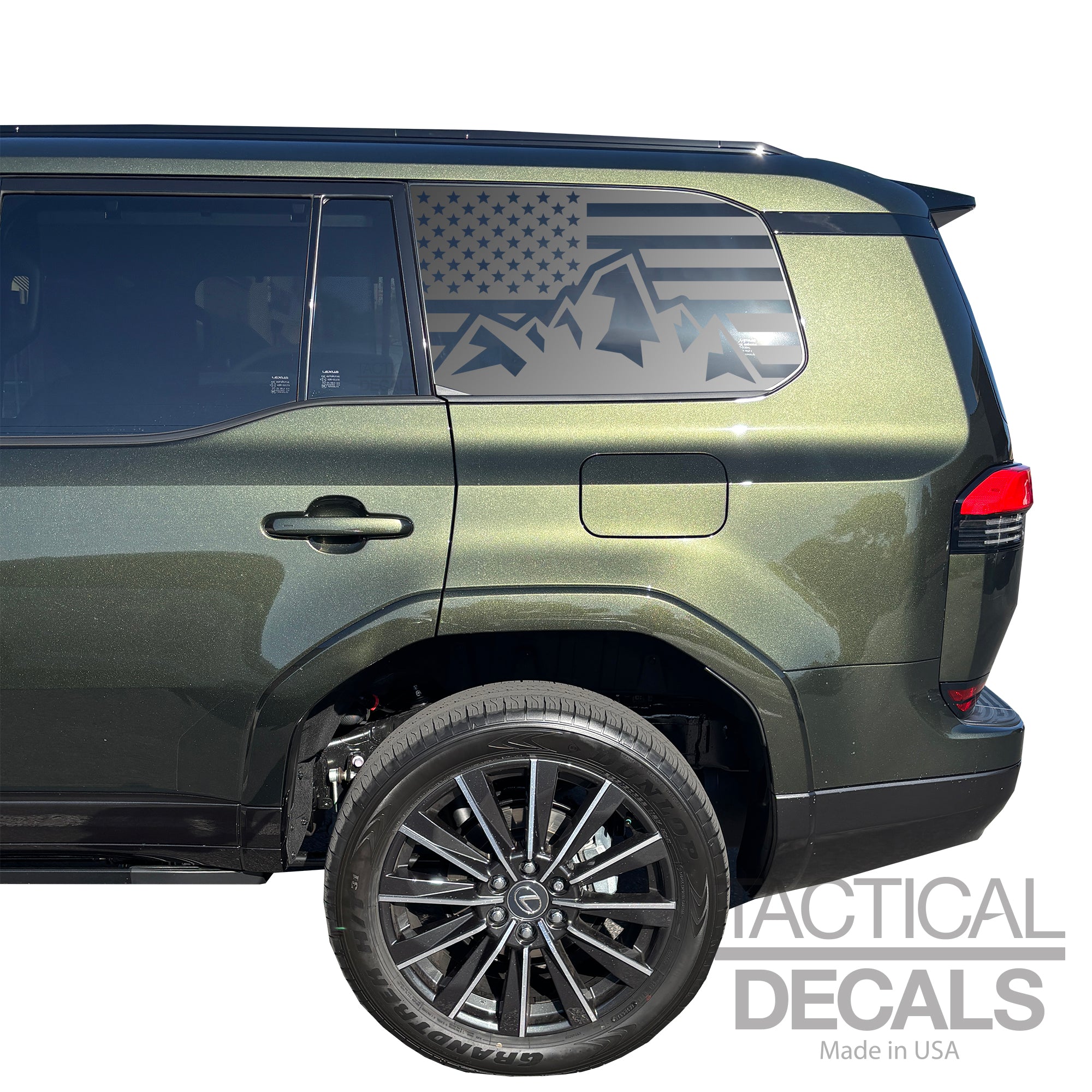 This is a custom designed USA Flag Decal with Mountain Scene for a 2024-2025 Lexus GX550 Rear Window